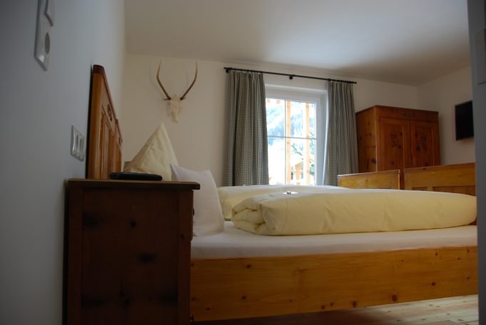 1 original möbliertes Tiroler Schlafzimmer aus Zirbenholz für 2 Personen mit TV und Balkon nach Osten gerichtet.